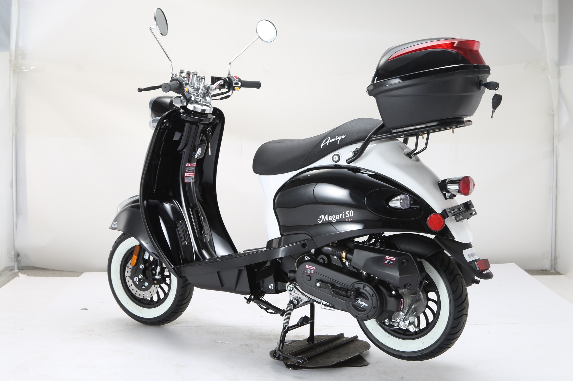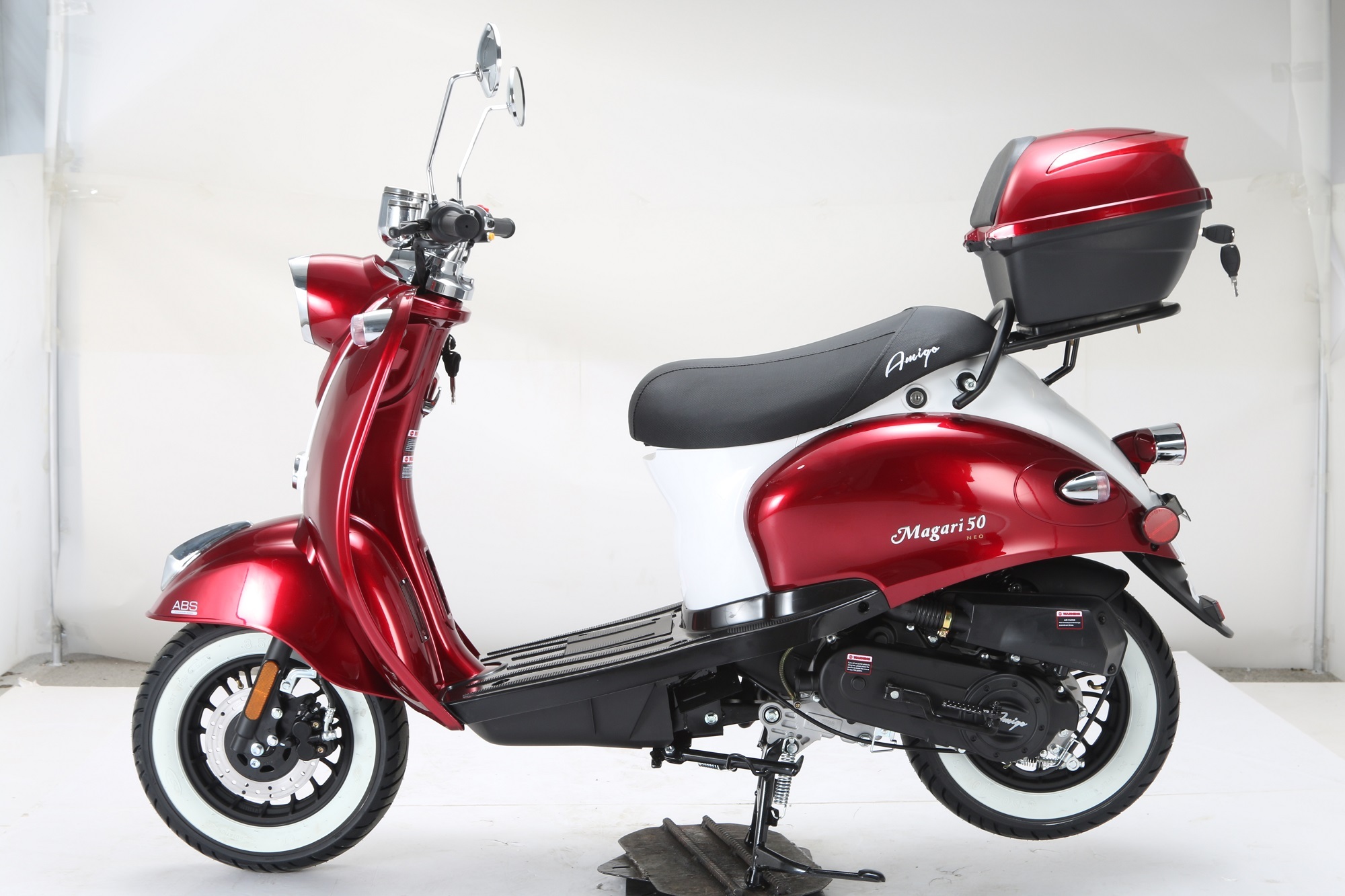 The Amigo Magari-50 SA is a 49cc moped featuring air cooling for optimal performance. With a maximum speed of over 25 mph, it offers swift and efficient travel for urban commutes. Its ignition system utilizes C.D.I technology for reliable starts, complemented by both electric and kick start options. This versatile moped combines convenience with agility, making it an ideal choice for short-distance travels.